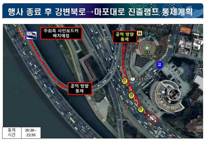 - 여의동로: 마포대교 남단부터 63빌딩 앞까지 전면 통제